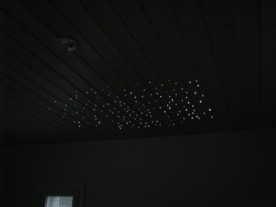 EEVEE Oy:n projekteja: nuoren parin modernin kodin sähkösuunnittelu ja -asennus. Kuvassa yläkerran makuuhuoneen tähtitaivas, joka on toteutettu ledkuituprojektorilla.